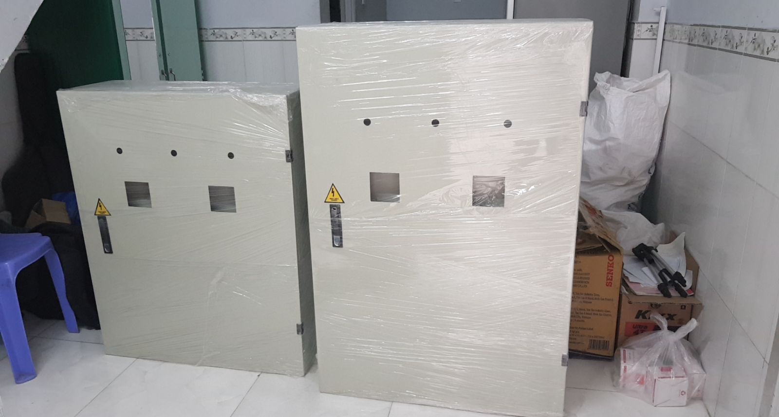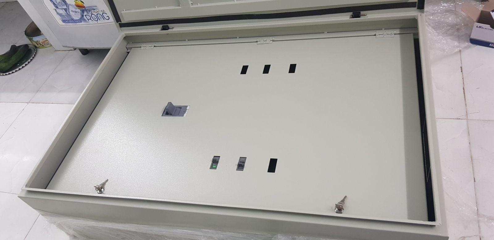 Sau khi gửi bản vẽ tới công ty gia công tủ điện chờ đợi 3 hôm.... và đây là tủ điện được gửi về. Nhiệm vụ bây giờ là gắn thiết bị vật tư vào và đấu dây nữa là ổn.