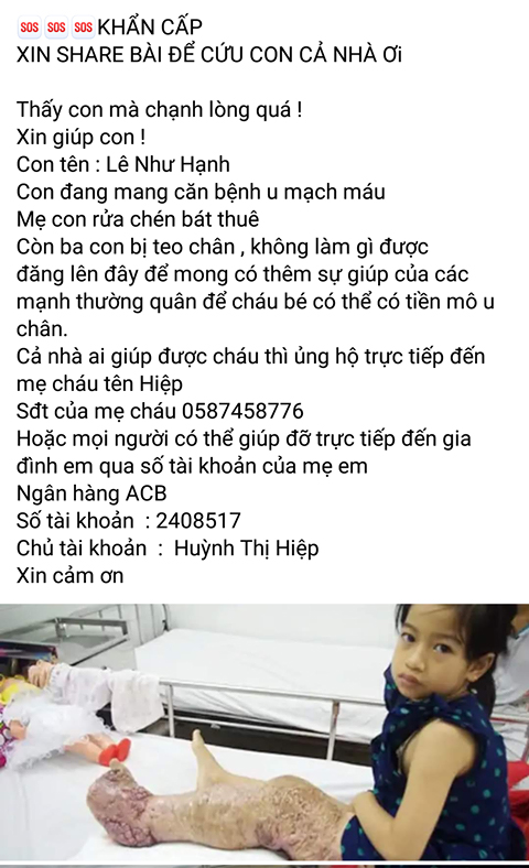 Cầu xin cộng đồng mạng giúp đỡ mỗi người chỉ cần vài chục hoặc vài trăm ngàn và đăng số tài khoản lên.