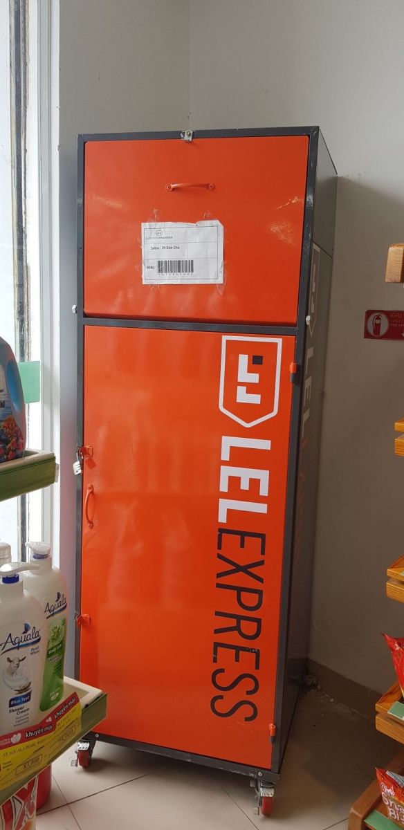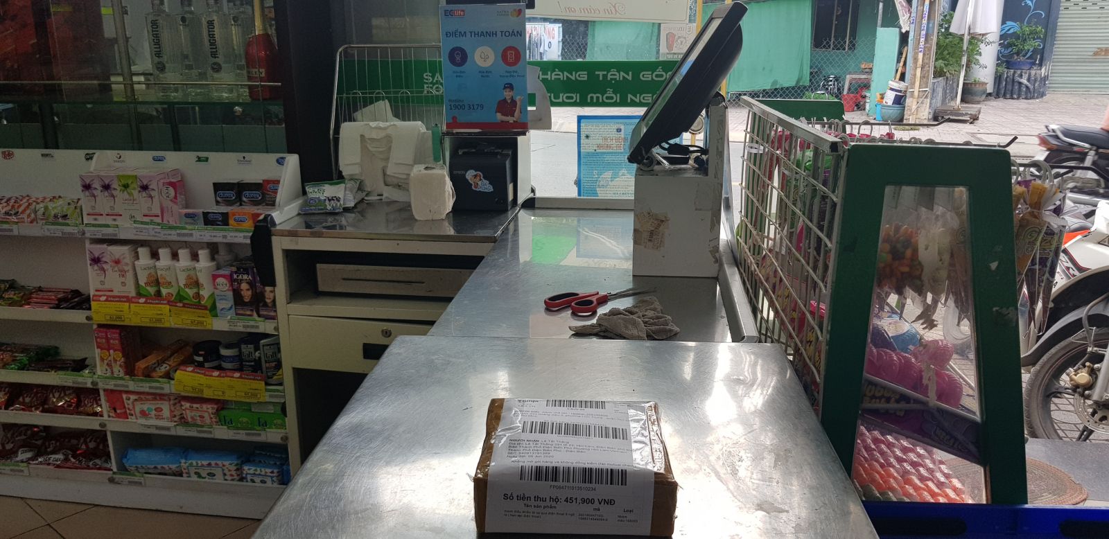 Các bạn để sản phẩm tại quầy chờ 1 lát nhân viên sẽ lấy và quét mã vạch xác nhận sau đó là bỏ vào thùng chứa như này