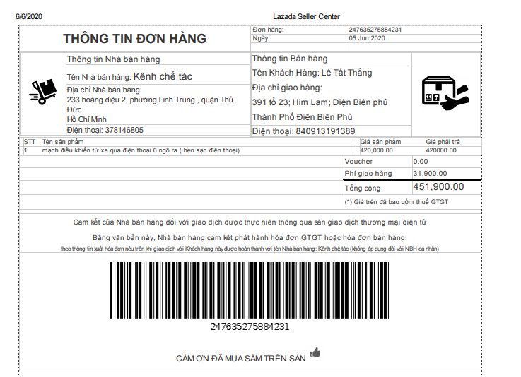 Các bạn sẽ in hóa đơn cho các sản phẩm đã chọn, sau khi in xong ta sẽ có tờ giấy ghi thông tin như sau