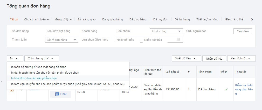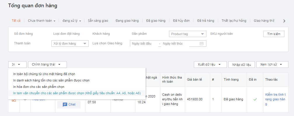 Tiếp theo các bạn sẽ click chuột vào " in tem vận chuyển "